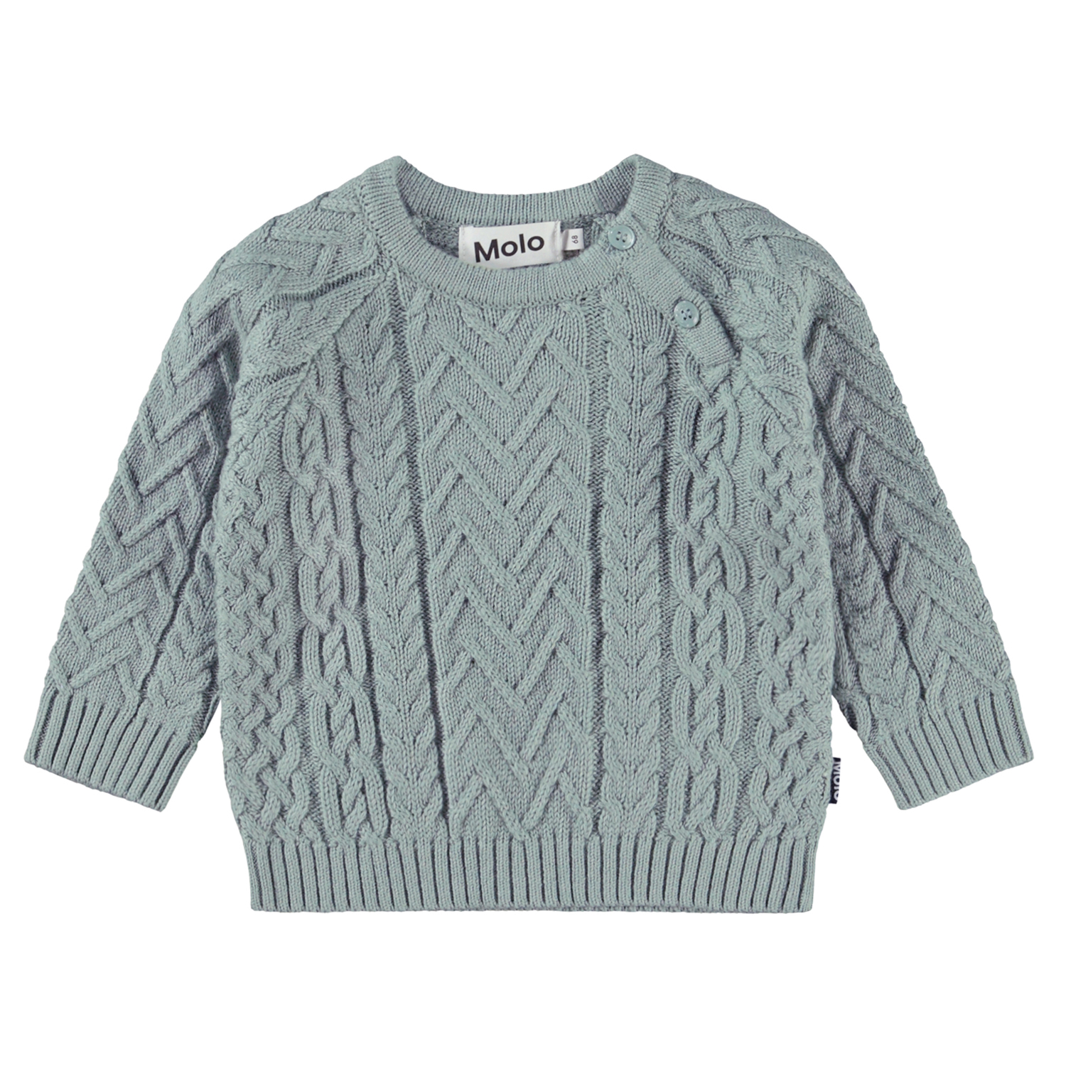 Svagt grön kabelstickad babytröja till de minsta. Denna tröja är tillverkad i en bomull/ull blandning, har ribb vid händer ch höfter, en rund hals med ribbkant och knappar vid halsen, så att tröjan är enkel att ta av och på. Matcha ev. denna trlja med byxorna, Sedge, i samma kvalitet för det perfekta setet.