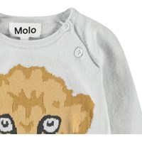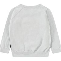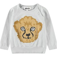 Mjuk stickad tröja för de små i ekologisk bomull. Tröjan har raglanärmar, ribbade kanter och en rund halsringning med två knappar framtill, vilket gör det enkelt att ta på och av. Tröjan är grå med ett gepardansikte framtill.