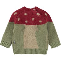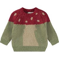 Grön och röd stickad babytröja med en svamp. Axlarna på tröjan bildar hatten på en svamp medan kroppen bildar stammen, och tillsamman har vi den sötaset svampen i skogen. Denna tröja är tillverkad i en mjuk alpaca/ull blandning, har rund hals med ribbkant, raglanärmar och ribbkant vid handleder och höfter.