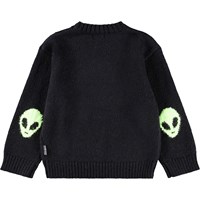 Svart stickad tröja i en blandning av alpackaull. Tröjan har en rolig detalj med vävda gröna utomjordingar på armbågarna. Tröjan har ribbade kanter runt halsen, ärmar och midja och en normal passform.