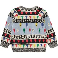 Multifärgad stickad kofta i bomull/ull för de små. Koftan har en rund hals med ribbstickad kant, samt ribbstickade kanter vid midjan och ärmarna. Den har knappar längs framsidan och ett mönster med ballonger och andra roliga karaktärer över hela.