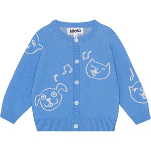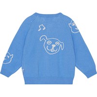 Blå stickad kofta till baby i mjuk ekologisk bomull. Koftan har raglanärmar, ribbkant vid ärmar, hals och höfter samt vita små knappar framtill. Koftan har stickade hundar och katter både fram- och baktill. Kombinera den med matchande byxor för ett komplett set.