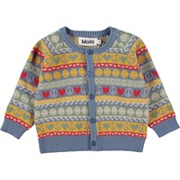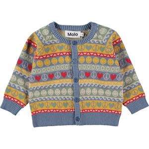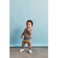 Brody är en stickad babykofta i bomull med många färgade ränder, där det gömmer sig både hjärtan, peacetecken och smileys. Koftan har knappar framtill. Kombinera koftan med de matchande babybyxorna.