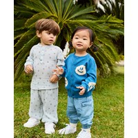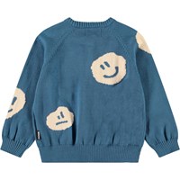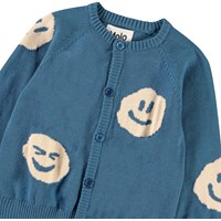 Stickad kofta för de små i ekologisk bomull. Koftan har raglanärmar, ribbade kanter och en rund halsringning. Koftan är blå med glada ansikten. Matcha med matchande byxor för en komplett outfit.