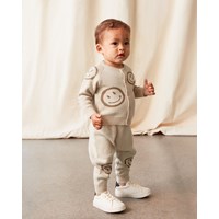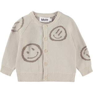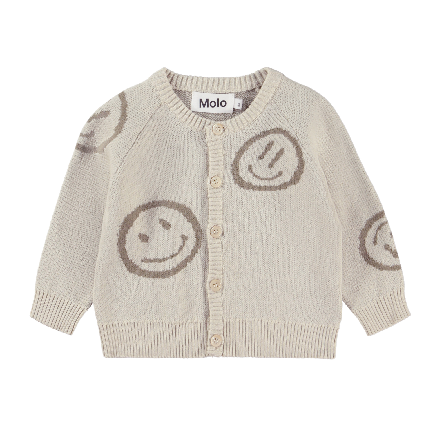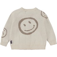 Brody är en beige stickad babykofta i bomull med olika smileys. Koftan har knappar framtill. Kombinera koftan med de matchande babybyxorna.