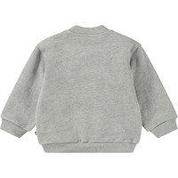 Grå melerad sweatshirt för de små i ekologisk bomullsjersey med en borstad insida, vilket gör den mjuk och varm att bära. Sweatshirten har en dragkedja framtill, en liten ribbad krage, raglanärmar och ribbade muddar och nederkant. Det finns en söt teddybjörn broderad framtill.