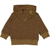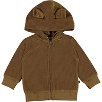 Dirk är en brun luvtröja i velour till baby. Tröjan har dragkedja och luva med små påsydda öron. Kombinera luvtrljan med matchande byxor.