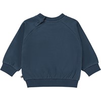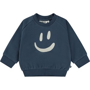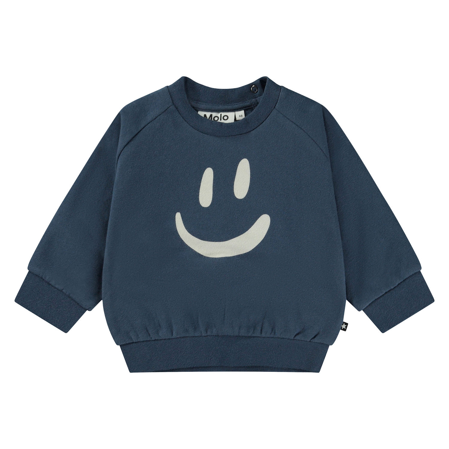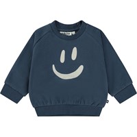 Mörkblå babytröja med en stor smiley mitt på magen, som är redo för bus. Denna tröja är tillverkad i 100% bomull, har rund hals med ribbkant, ribbkant vid handleder och höfter och tryckknappar vid halsen, vilket gör den enkel att ta av och på. Matcha ev. dena tröja med byxorna, Simeon, i samma mönster för det perfekta setet.