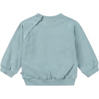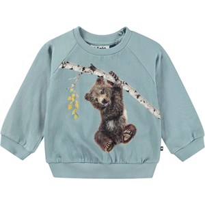 Ljusblå sweatshirt för de små i ekologisk bomullsjersey med en oborstad insida, vilket gör den behagligt sval på varma dagar. Sweatshirten har raglanärmar, ribbstickade muddar i midjan och ärmsluten, samt en rund hals med två tryckknappar på baksidan, vilket gör den enkel att ta på och av. På framsidan av sweatshirten finns en söt bild av en björnunge som klättrar i en björk.