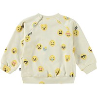 Lätt sweatshirt för de små i ekologisk bomullsjersey med en oborstad insida, vilket gör den behagligt sval på varma dagar. Sweatshirten har raglanärmar, ribbstickade muddar i midjan och ärmsluten, samt en rund hals med två tryckknappar på baksidan, vilket gör den enkel att ta på och av. Trycket består av söta, gula pixel-emojis.