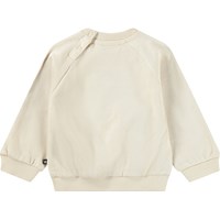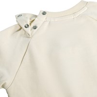 Krämfärgad, mjuk sweatshirt för de små i ekologisk bomull med regnbågsmönster. Sweatshirten har raglanärmar, ribbade kanter och en rund halsringning med tryckknappar bak, för att göra den enkel att ta på och av.