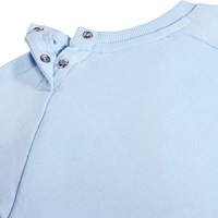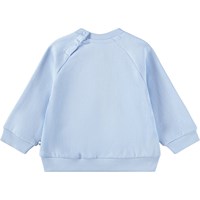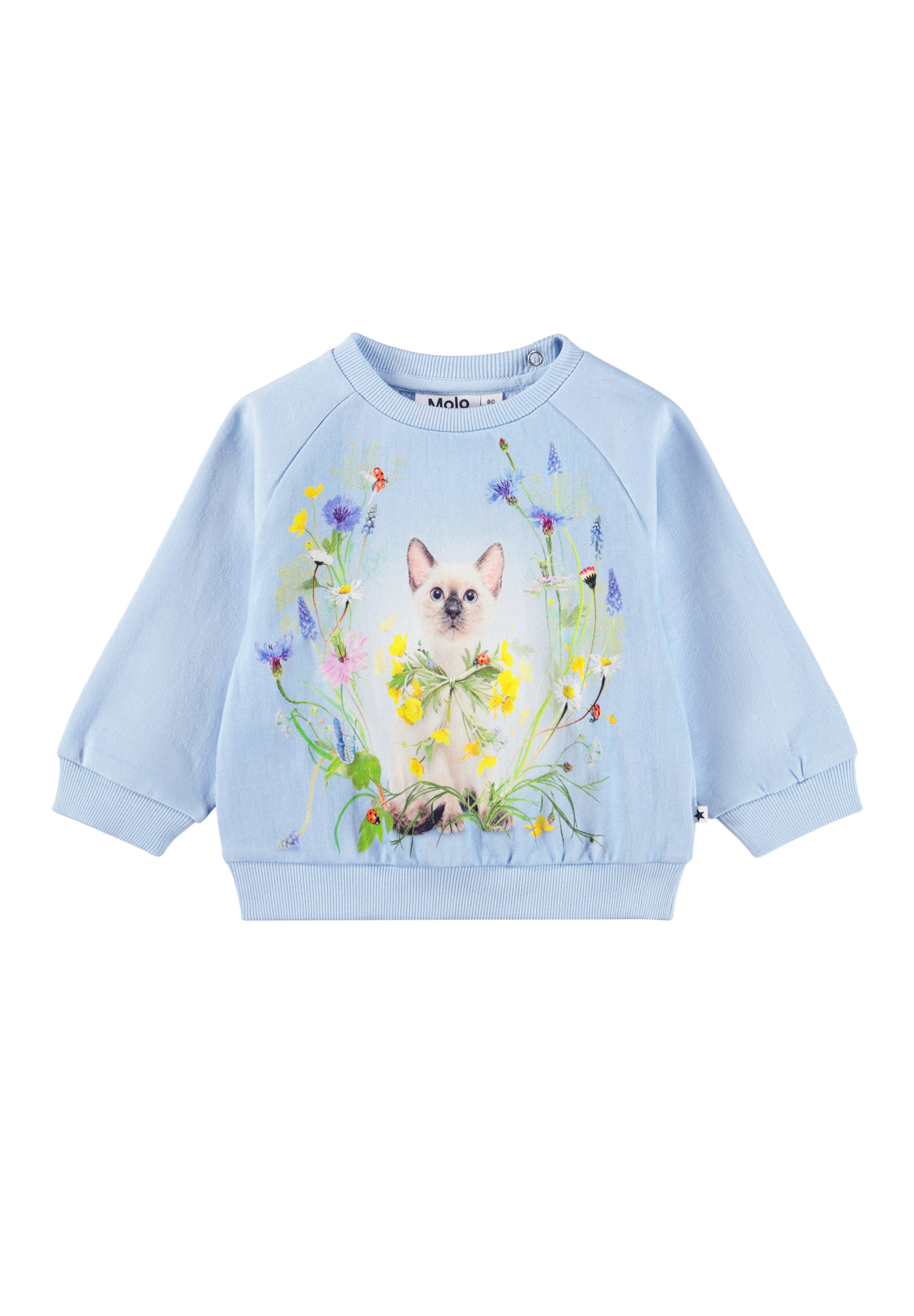 Blå, mjuk sweatshirt för de små i ekologisk bomull med kattmotiv. Sweatshirten har raglanärmar, ribbade kanter och en rund halsringning med tryckknappar bak, för att göra den enkel att ta på och av.