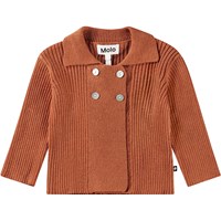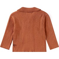 Brun stickad kofta i bomull/ull för de små. Koftan har en stor krage och knäpps med 4 knappar vid halsen.