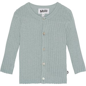 Blå kofta till baby i mjuk ribbad viskosblandning. Koftan är tight, har rund hals med en liten fin ribbkant och pärlemorsknappar framtill. Kombinera koftan med matchande byxor för ett mjukt och lyxigt set.