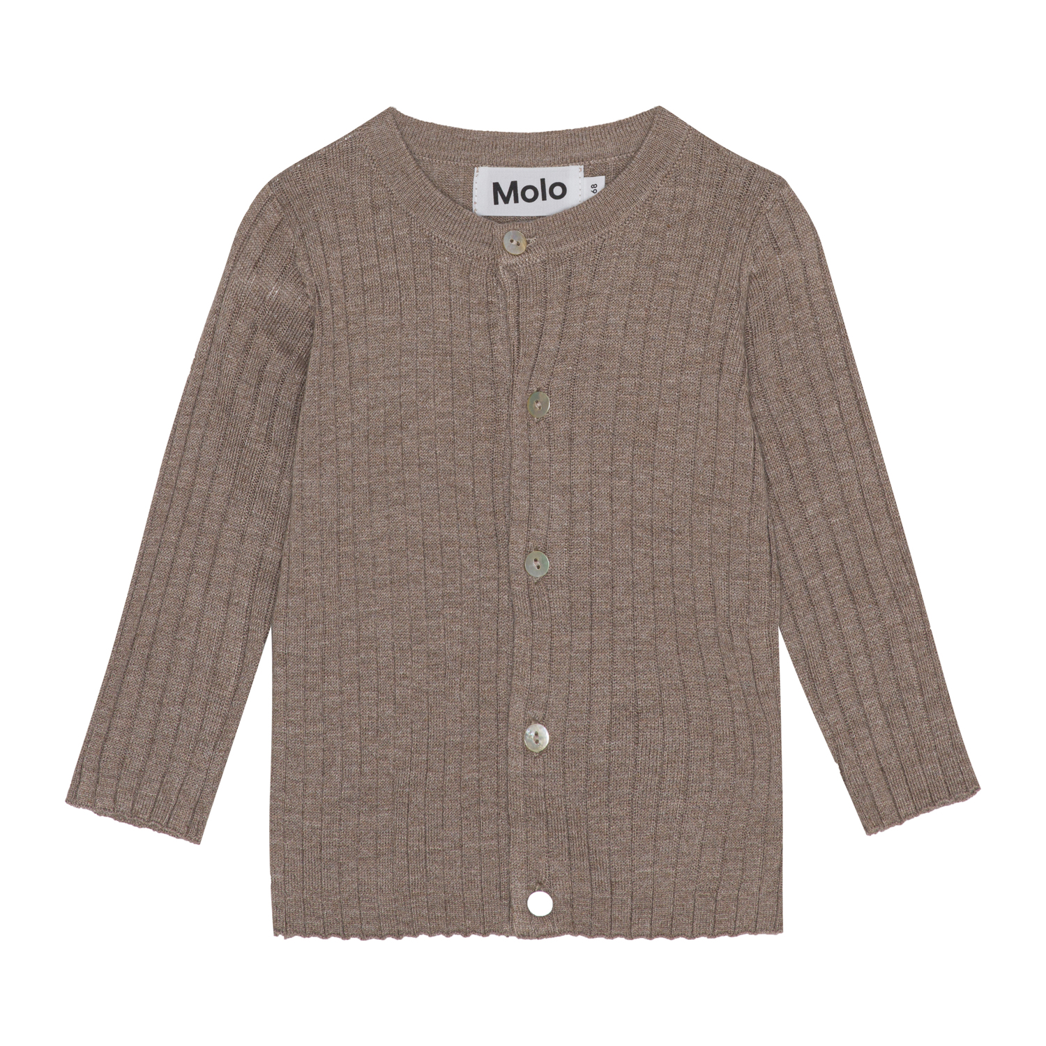 Ljusbrun stickad babykofta. Denna kofta är tillverkad i en mjuk cashmere/viskos blandning, har rund hals, långa ärmar och små knappar med pärlemorsknappar framtill. Matcha ev. denna kofta med byxorna, Shadow, i samma kvalitet för det perfekta setet, som är både varmt och mjukt.
