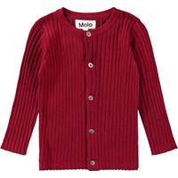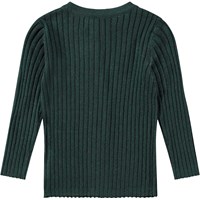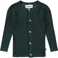 Mörkgrön stickad kofta för de små. Koftan är åtsittande och har en rund hals med en fin ribbad kant. Den har knappar längs framsidan.