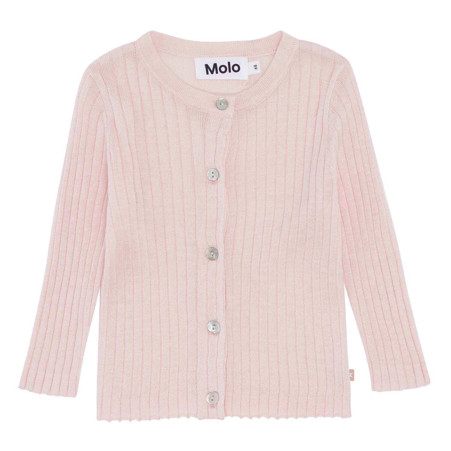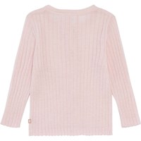 Georgette är en fin rosa ribbstickad kofta med cahsmere. Koftan har fina pärlemorsknappar hela vägen ner. Kombinera med matchande ribbstickade byxor.