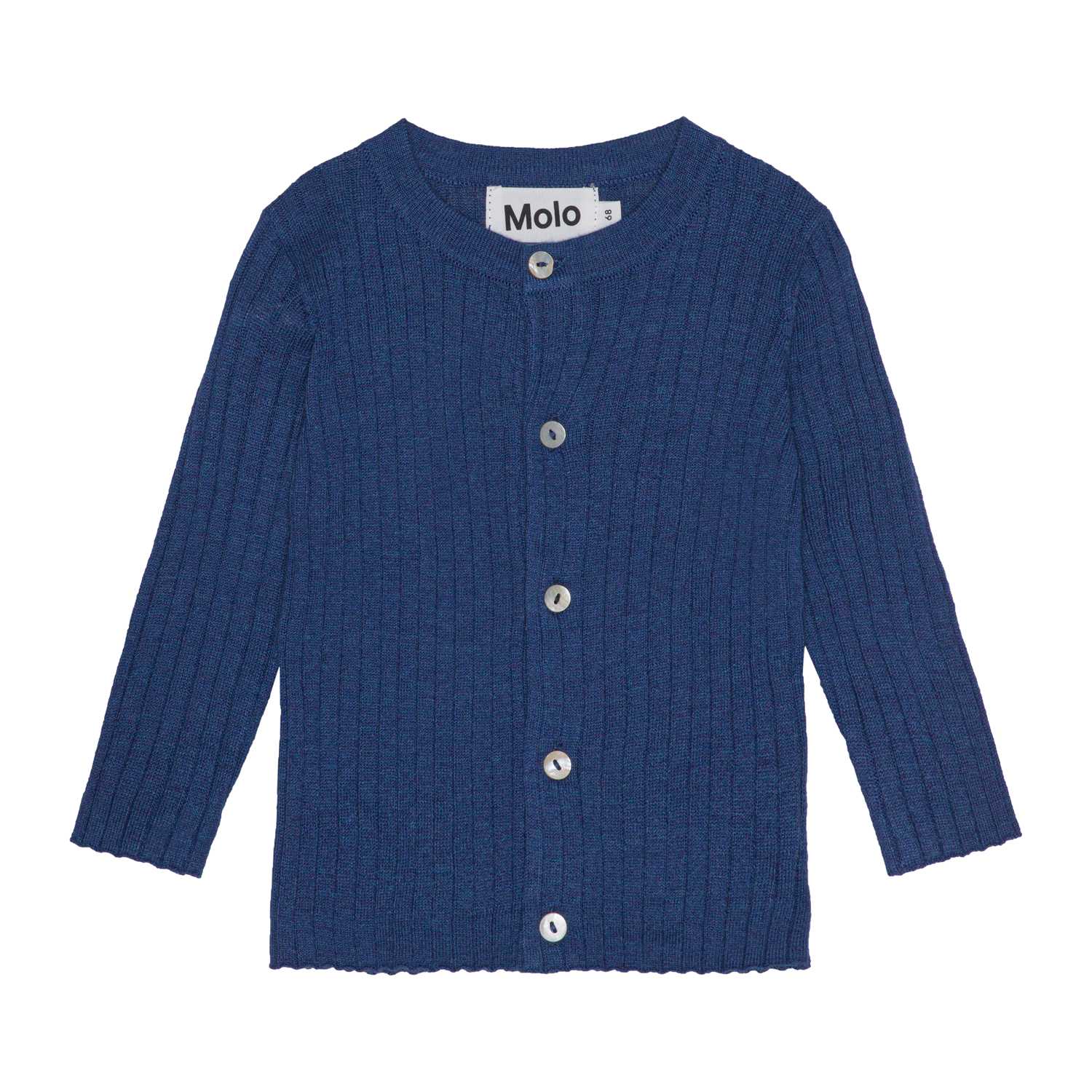 Mörkblå stickad babykofta. Denna kofta är tillverkad i en mjuk cashmere/viskos blandning, har rund hals, långa ärmar och små knappar med pärlemorsknappar framtill. Matcha ev. denna kofta med byxorna, Shadow, i samma kvalitet för det perfekta setet, som är både varmt och mjukt.
