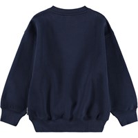 Mörkblå sweatshirt i mjuk ekologisk bomull med ett stort spraymålat leende ansikte. Sweatshirten har en oversize passform med ribbade kanter runt halsen, ärmar och midja.