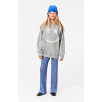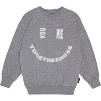 Denna gråmelerade sweatshirt är tillverkad av ekologisk bomull. Den har en rund hals med ribbad kant och ribbad kant i midjan och ärmsluten. Sweatshirten har en placerad tryck på framsidan och en vanlig passform. Trycket är en grafisk text som visar texten "You Me Togetherness", vilket tillsammans bildar ett stort leende.