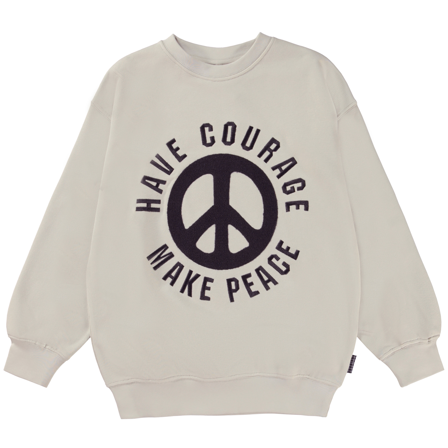 Mar är en beige unisex sweatshirt med broderat peacetecken, samt texten "Have courage - maje peace" på bröstet. Tröjan har en bra längd.