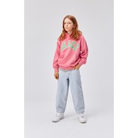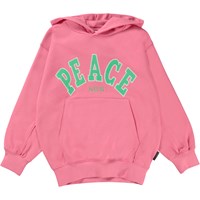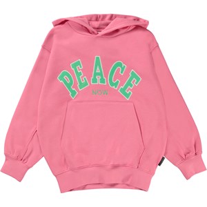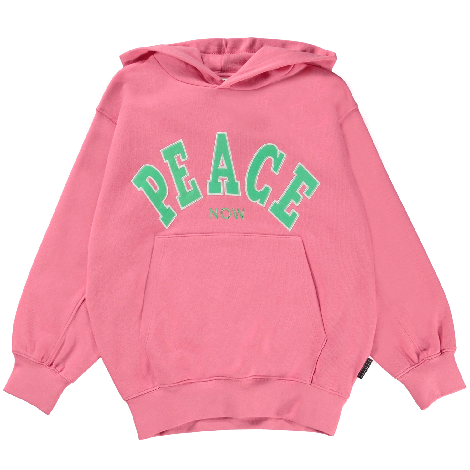 Maxx är en rosa unisex luvtröja med texten "peace now". Luvtröjan har känguruficka framtill och ribbkant vid ärmslut och nertill.