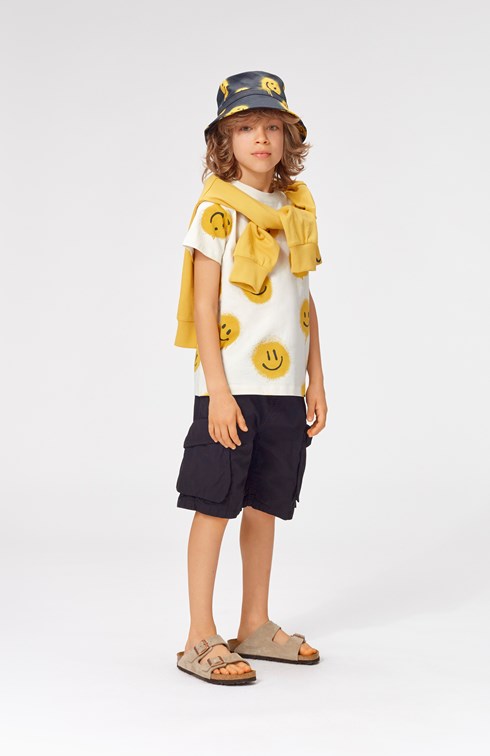 Mik är en solgul sweatshirt med en svart smileytag mitt på magen.