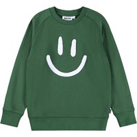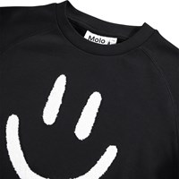 Svart sweatshirt i mjuk ekologisk bomull med raglanärmar, ribbade kanter runt halsen, ärmar och midjan. Sweatshirten har en lös passform med en vit och mjuk brodyr med ett leende på framsidan.