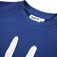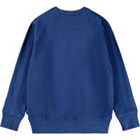 Blå sweatshirt i mjuk ekologisk bomull med raglanärmar, ribbade kanter runt halsen, ärmar och midjan. Sweatshirten har en lös passform med en vit och mjuk brodyr med ett leende framtill.