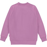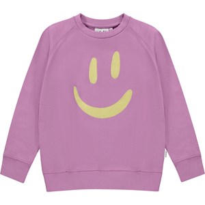 Lila sweatshirt med stort leende broderi i gult framtill. Denna tröja har raglanärmar, rund hals med ribbkant, ribbkant vid handleder och höfter och en normal passform.