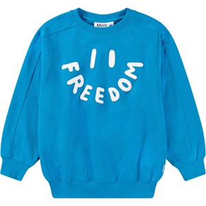 Blå sweatshirt i mjuk ekologisk bomull med ribbade kanter vid halsen, ärmar och nederkant. Sweatshirten har raglanärmar och en lös passform med ett främre tryck av ett leende ansikte, där ordet 'Freedom' bildar munnen.