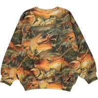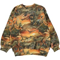 Grön och orange sweatshirt med dinosaurier. Här ses många olike dinosaurier som vandrar runt bland sanddynirna i skymningen, precis innan natten faller på. Ovanför dem syns månens sken som påminner dem om att de är en del av något större. Denna tröja är tillverkad i 100% bomull, har rund hals med ribbkant, ribbkant vid handleder och höfter och en lös passform. Matcha ev. dena tröja med byxorna, Adan, i samma mönster för det perfekta setet.