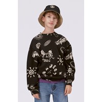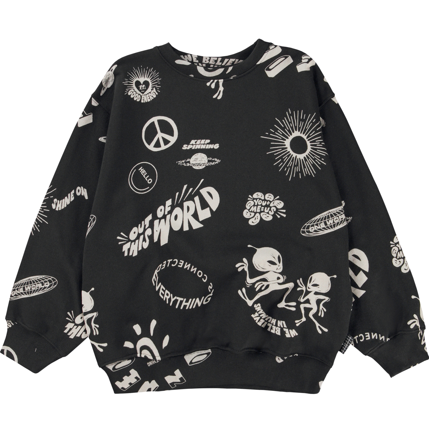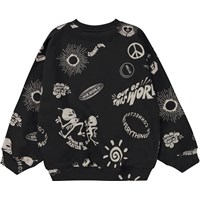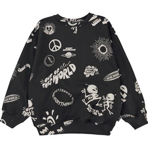 Svart sweatshirt med beigt mönster.Här ses elementer från kollektionen. Säg hej till dansande aliens, den skinande solen, alla planeterna, smileys, bankande hjärtan och peactecken. Vilken fest! Denna tröja är tillverkad i 100% bomull, har rund hals med ribbkant, ribbkant vid höfter och handleder och en normal passform. Matcha ev. tröjan med byxorna, Alvar, i samma mönster för det perfekta setet. Molo´s tie-dye är handgjort och kan därför variera från plagg till plagg.
