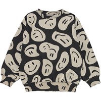 Svart sweatshirt med beige smileys som svävar runt och är förvrängda, för det finns massor av sätt att ha roligt på. Denna tröja är tillverkad i 100% bomull, har rund hals med ribbkant, ribbkant vid handleder och höfter och en lös passform. Matcha ev. dena tröja med byxorna, Adan, i samma mönster för det perfekta setet.