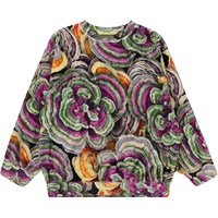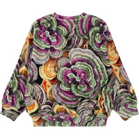 Multifärgad sweatshirt i velour med svampar i gröna, lila och gula nyanser. Mönstret är inspirerat av de vackra avbildningrna som finns på de trädnedbrytande konsolsvamparna. Dessa svampar är en viktig del av skogens ekosystem och bryter ner gamla träd för att göra plats åt nytt liv. Denna sweatshirt är tillverkad i en mjuk bomull/polyester blandning, har en rund hals med ribbkant, långa ärmar med ribbkant, ribbkant vid häfter och en lös passform. Matcha ev. denna tröja med byxorna, Alfi, i samma mönster för en äkta fungi outfit.