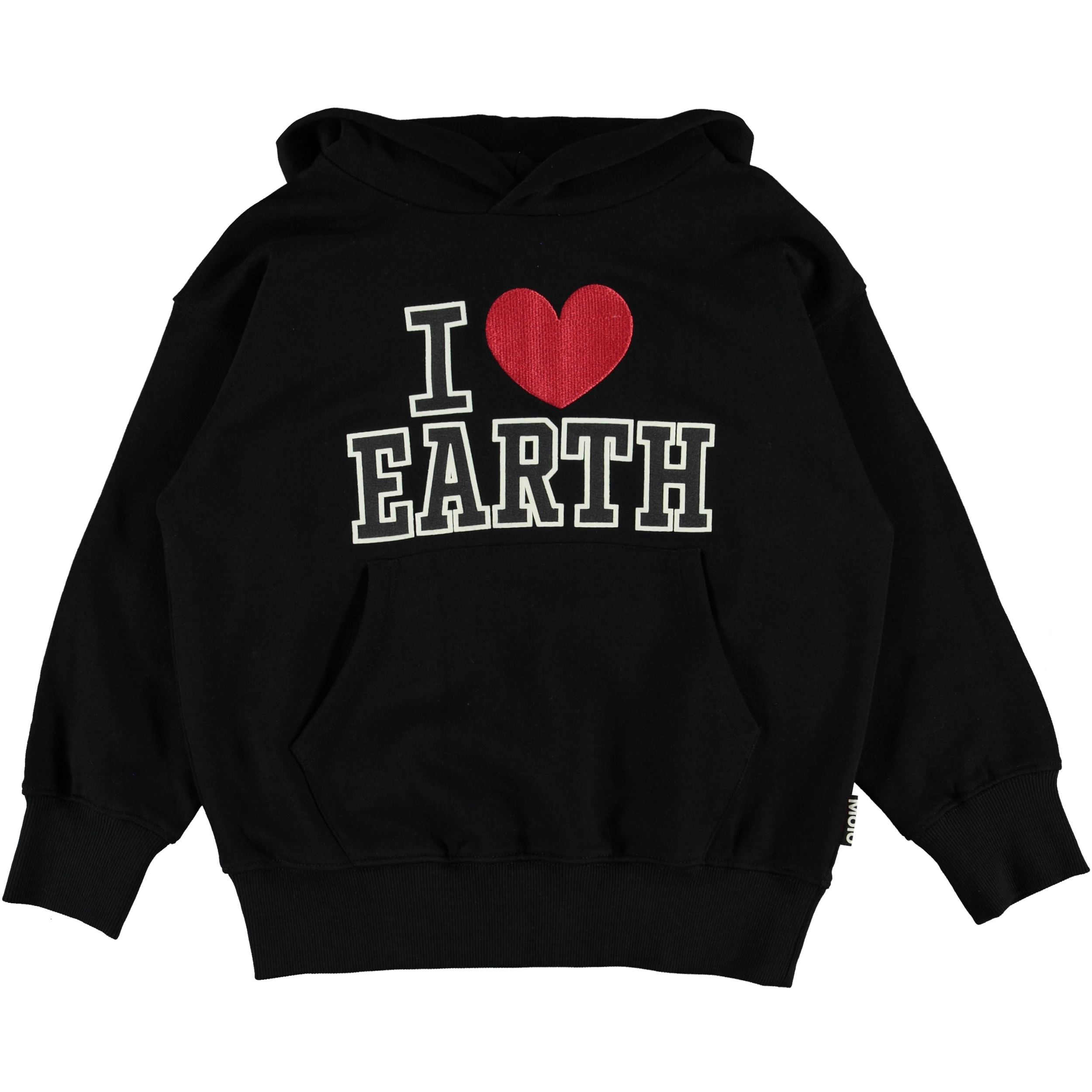 Moz är en svart hoodie, där färgen sticker ut och har "I love earth" broderad över bröstet. Moz har känguruficka och ribb vid ärmslut och nederkant.