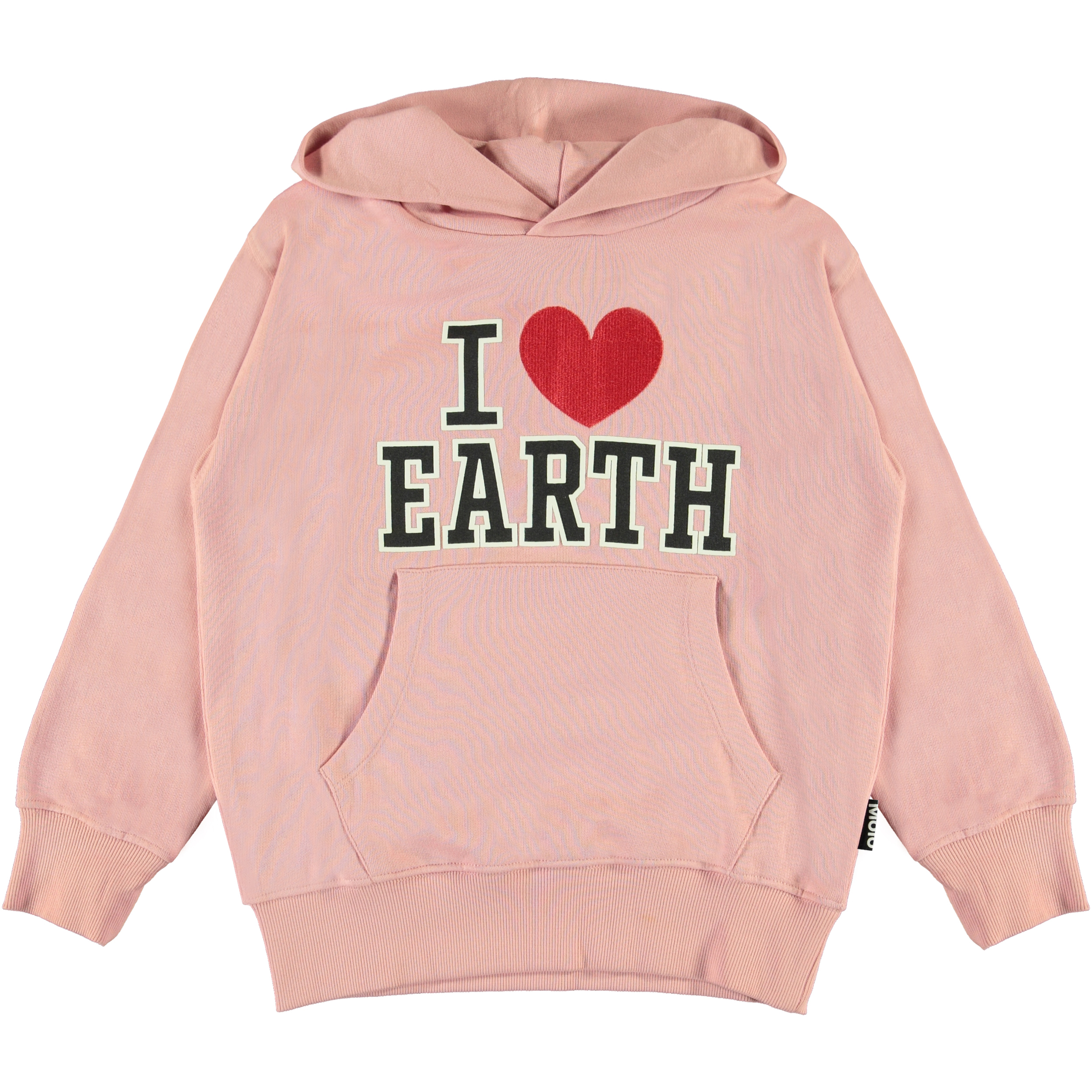 Moz är en rosa hoodie, där färgen sticker ut och har "I love earth" broderad över bröstet. Moz har känguruficka och ribb vid ärmslut och nederkant.