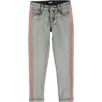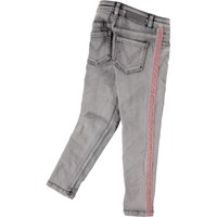 Adele är slim fit grå jeans i en tvättad look med rosa velour band i sidorna. Byxorna har fickor fram och bak. Var uppmärksam på att storlekarna upp till och med 134 har tryckknapp och inte vanlig jeansknapp.