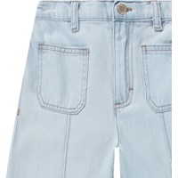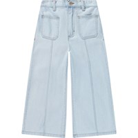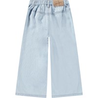 Ljusblåa croppade byxor i viskos med sydda veck och denimlook. Byxorna har en tryckknapp och dragkedja i midjan, bältesöglor och en justerbar knapp på insidan för en bra passform. De har en utsvängd silhuett och sydda fickor framtill.