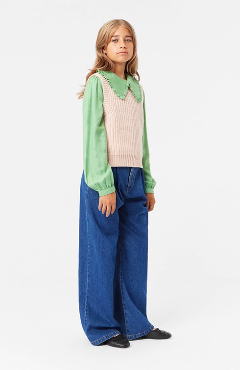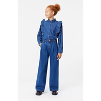 Vida blåa jeans i mjuk bomull med framfickor, passpoalficka bak och ett stort veck fram för en kantig silhuett. Midjan har hällor för skärp, knapp och dragkedja samt invändigt justerbart gummiband för en bekväm passform.