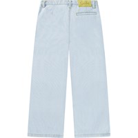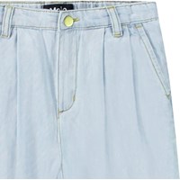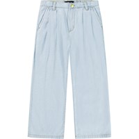 Breda ljusblå jeans med framfickor, bakficka och stora veck framtill för en fyrkantig silhuett. De har midja med hällor för skärp, knapp och dragkedja, samt invändigt justerbart gummiband för en bra passform.