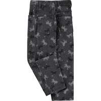 Mörkgrå jeans med lös passform. Dessa jeans har 5 fickor, raka ben och dragkedja. Tillverkade av speciellt vävd jacquard denim med svarta och grå hästar.Midjan på jeansen kan justeras med en invändig resår, vilket säkerställer en perfekt passform för alla barn. Storlekarna 92-134 har en tryckknapp, vilket gör det enkelt att ta av och på byxorna, medan storlekarna 140-176 har en vanlig jeansknapp.