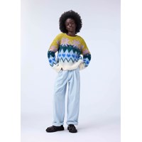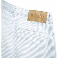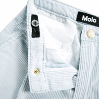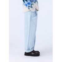 Ljusblå byxor i mjuk bomullssammet med en lös passform. Byxorna är något höga i midjan med vida ben och veck fram som skapar en fin silhuett. De har två sidofickor och en bakficka. Midjan har en knapp- och dragkedjestängning samt en invändig justerbar resår för en bra passform.