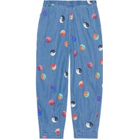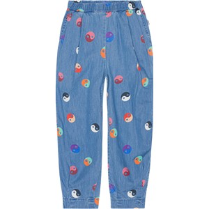 Lätta blå jeansbyxor i bomull. Byxorna har gummiband i midjan som gör dem enkla att ta av och på och ett veck framtill som ger dem volym. Byxorna har fickor i sidosömmarna och ett insytt veck nertill som också ger volym. Byxorna har ett mönster med yin och yang symboler.