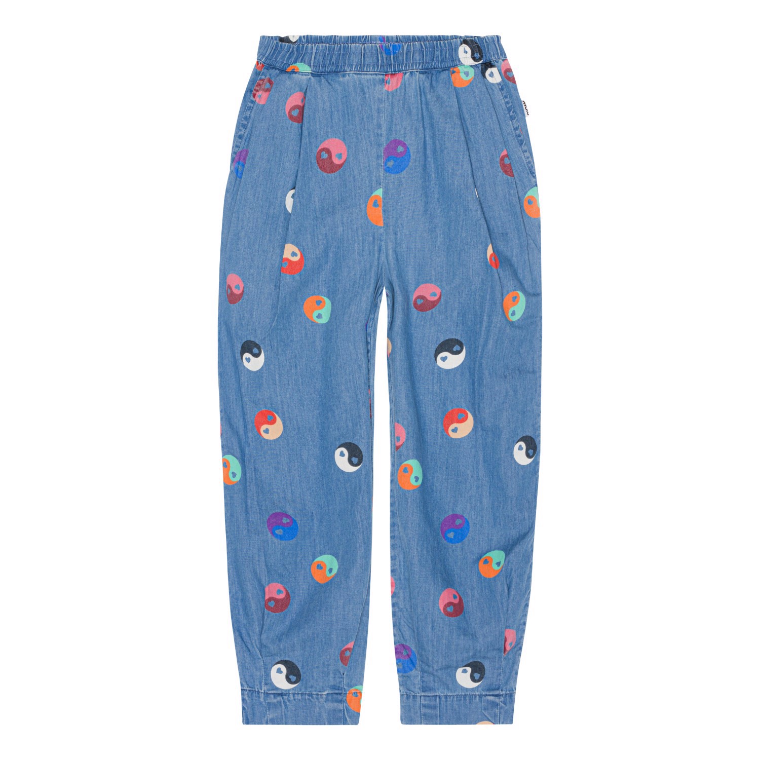 Lätta blå jeansbyxor i bomull. Byxorna har gummiband i midjan som gör dem enkla att ta av och på och ett veck framtill som ger dem volym. Byxorna har fickor i sidosömmarna och ett insytt veck nertill som också ger volym. Byxorna har ett mönster med yin och yang symboler.