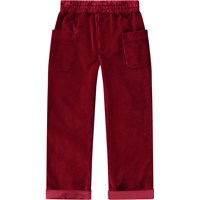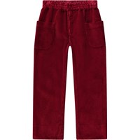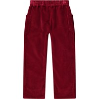 Vinröda sammetsbyxor i mjuk bomull. Byxorna har en fyrkantig siluett med fickor på sidan och gummiband i midjan. Det finns också ett invändigt dragsnöre för en bra passform. Dessa byxor är perfekta att rulla upp, eftersom tyget är slätt när det är vikt.