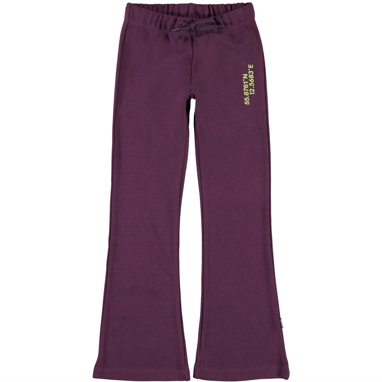 Alfreda är ett par lila träningsbyxor med en lätt svängning i benen. Byxorna har en elastisk midja med knytband.