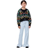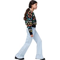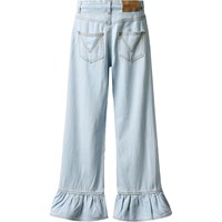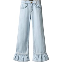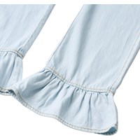 Ljusblå denimbyxor med eleganta volangdetaljer vid fickorna och vid byxbenens nederkant. Jeansen har fyra fickor, hällor och en justerbar resår i midjan för optimal passform. De minsta storlekarna (92-134) har en praktisk tryckknapp, medan storlekarna 140-176 är utrustade med en klassisk jeansknapp.