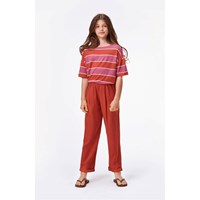 Amie är ett par mörkröda lösa byxor. Byxorna har uppvikta ben och en bekväm resår i midjan.