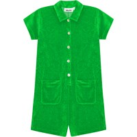 Grön shorts byxdräkt i en mjuk bomullsfrotté. Byxdräkten har en klassisk krage, påsydda fickor framtill och ljusa pärlemorsknappar. Bomullsfrotté är skönt att ha på och torkar snabbt efter bad.